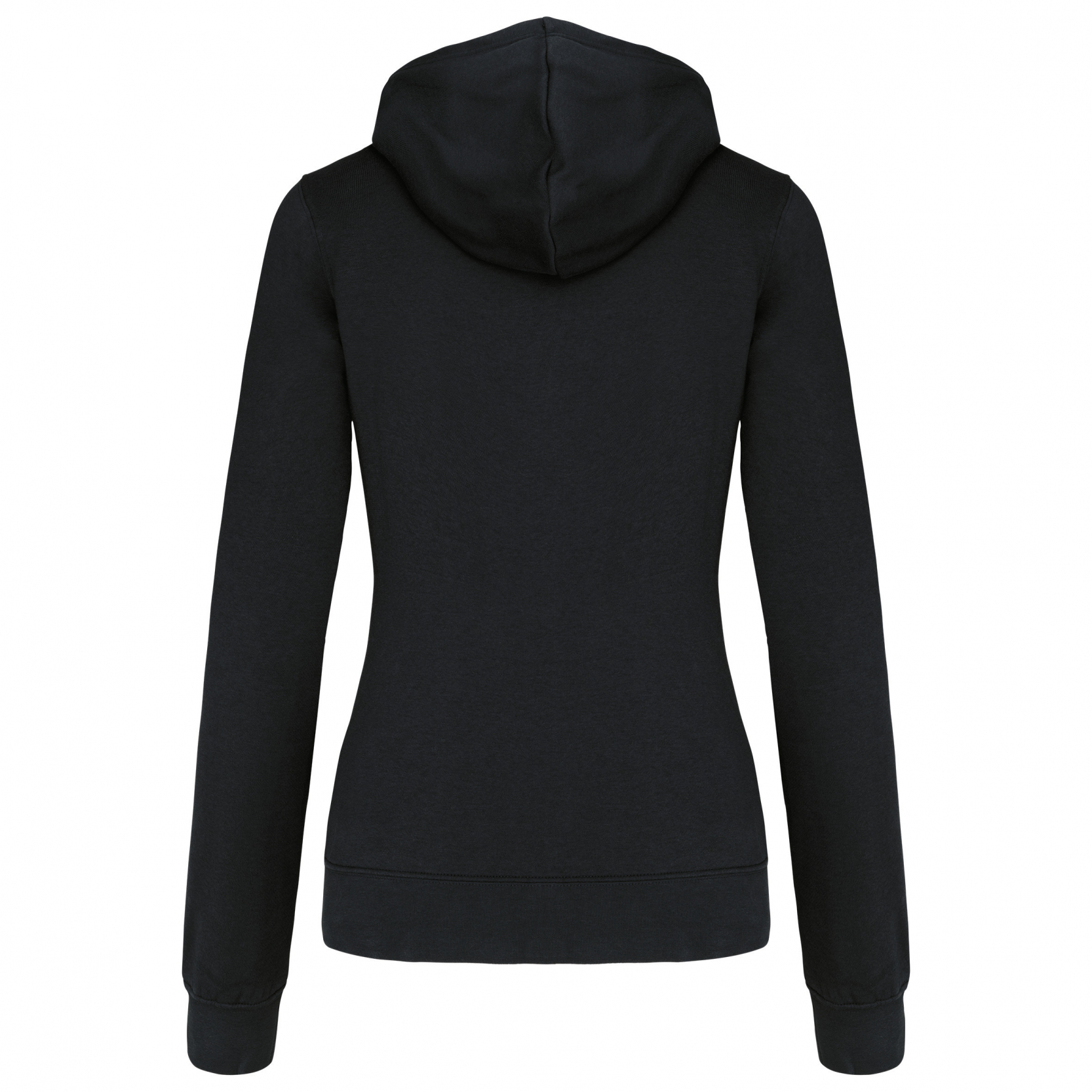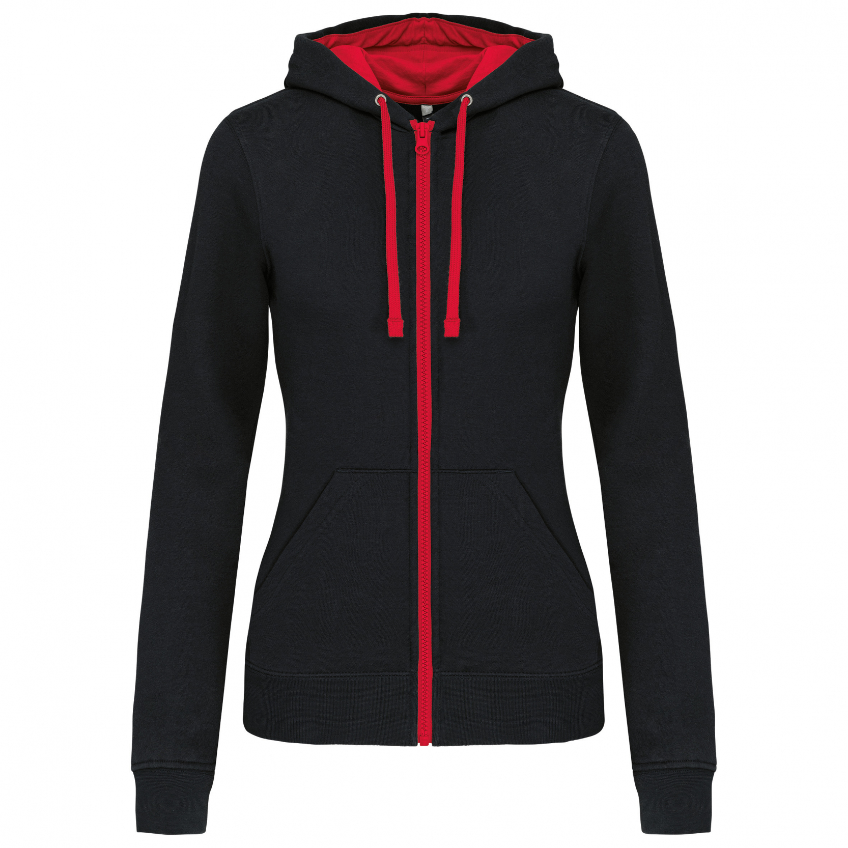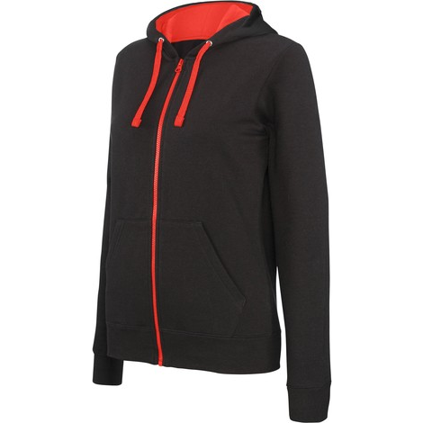 80% coton peigné / 20% polyester. Molleton gratté. Passe fil écouteurs dans la poche kangourou et encolure. Bord-côte bas de manches et de vêtement. Capuche doublée et contrastée avec cordon de serrage. Zip YKK® contrasté. 280 g/m².